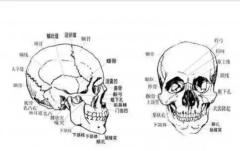 只有了解面部結(jié)構(gòu)才能在塑造人物形象時(shí)做到心中有數(shù),有的放矢。頭部由23塊骨骼組成,分為腦顱和面顱兩大部分。
