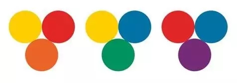 2. 間色是由兩種原色相混合而成的顏色,也稱為第二次色。顏料三間色是橙(黃+紅),綠(黃+藍),紫(紅+藍)。