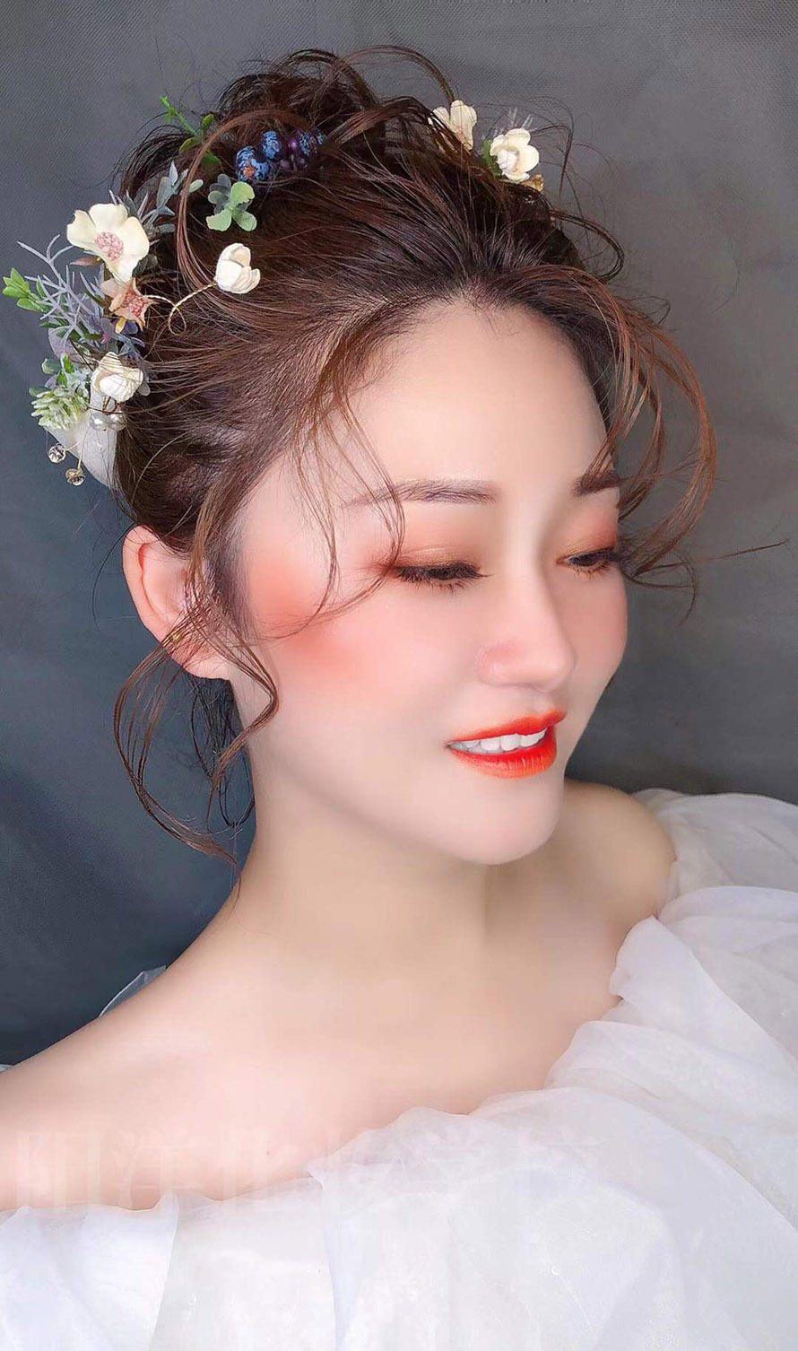手法簡約忌堆疊——整體造型,重在突出新娘柔美的身線和真實、自然的美。做造型時不宜采用過多的造型物品來堆砌,亦不可濃妝艷抹,而應(yīng)理性地采用輕描淡寫的手法,運用較少量的化妝品和柔淡的彩妝色,突顯新娘的自然美。