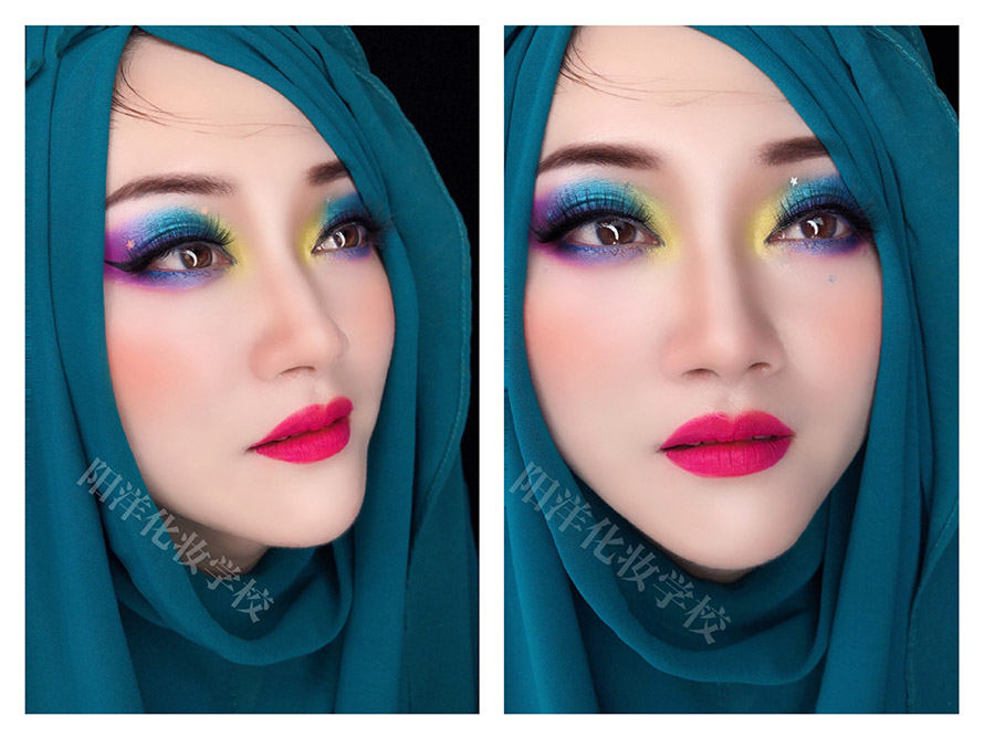 色彩呈現(xiàn)強(qiáng)烈耀目的視覺沖擊力,冷暖色對比色明暗色。整體妝容和諧相呼應(yīng),
