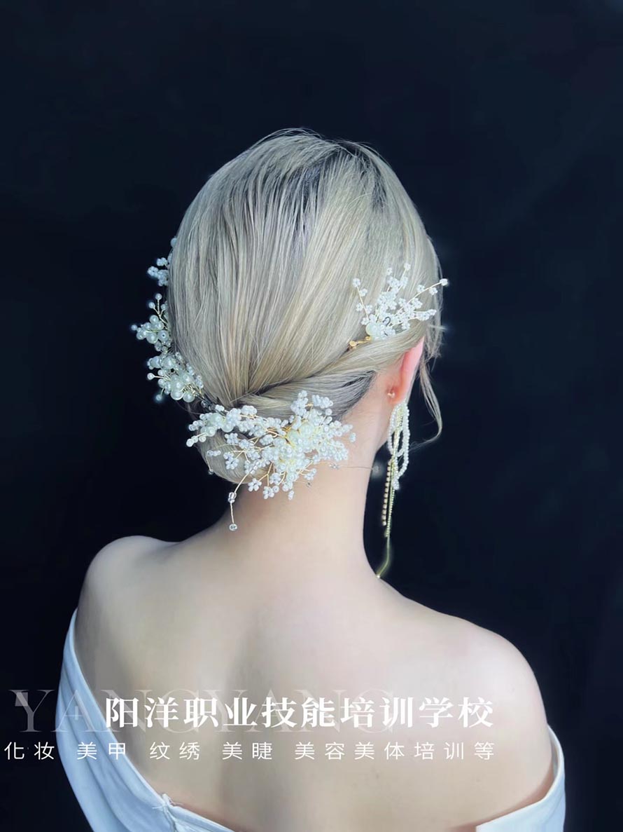 此款造型的重點(diǎn)是后發(fā)區(qū)。為了增強(qiáng)浪漫的氣息,將劉海處頭發(fā)自然梳理于兩側(cè),將剩余的頭發(fā)固定在后區(qū),將發(fā)尾燙卷,擺放出有層次圓弧型,用精致的小珠串頭飾。打造氣質(zhì)自然款造型