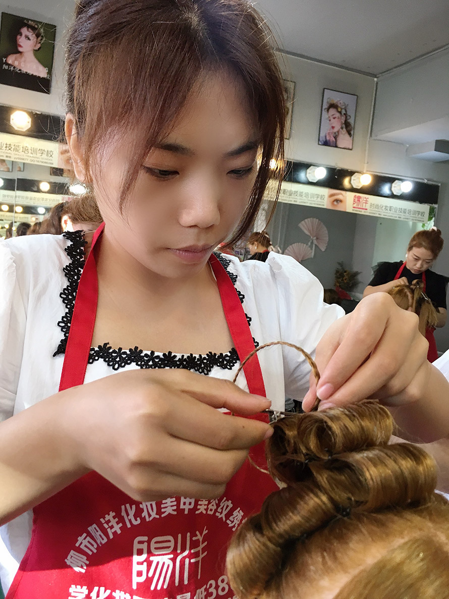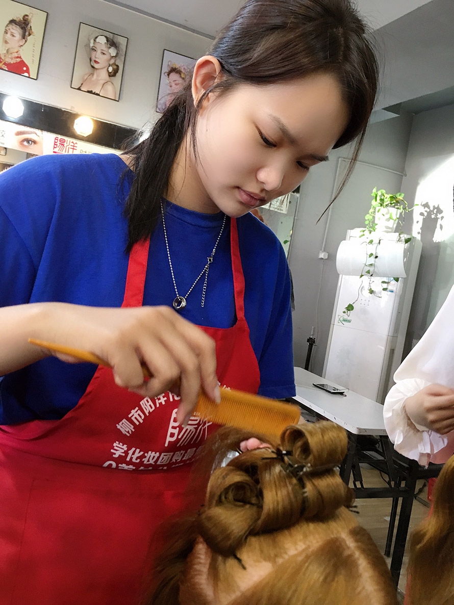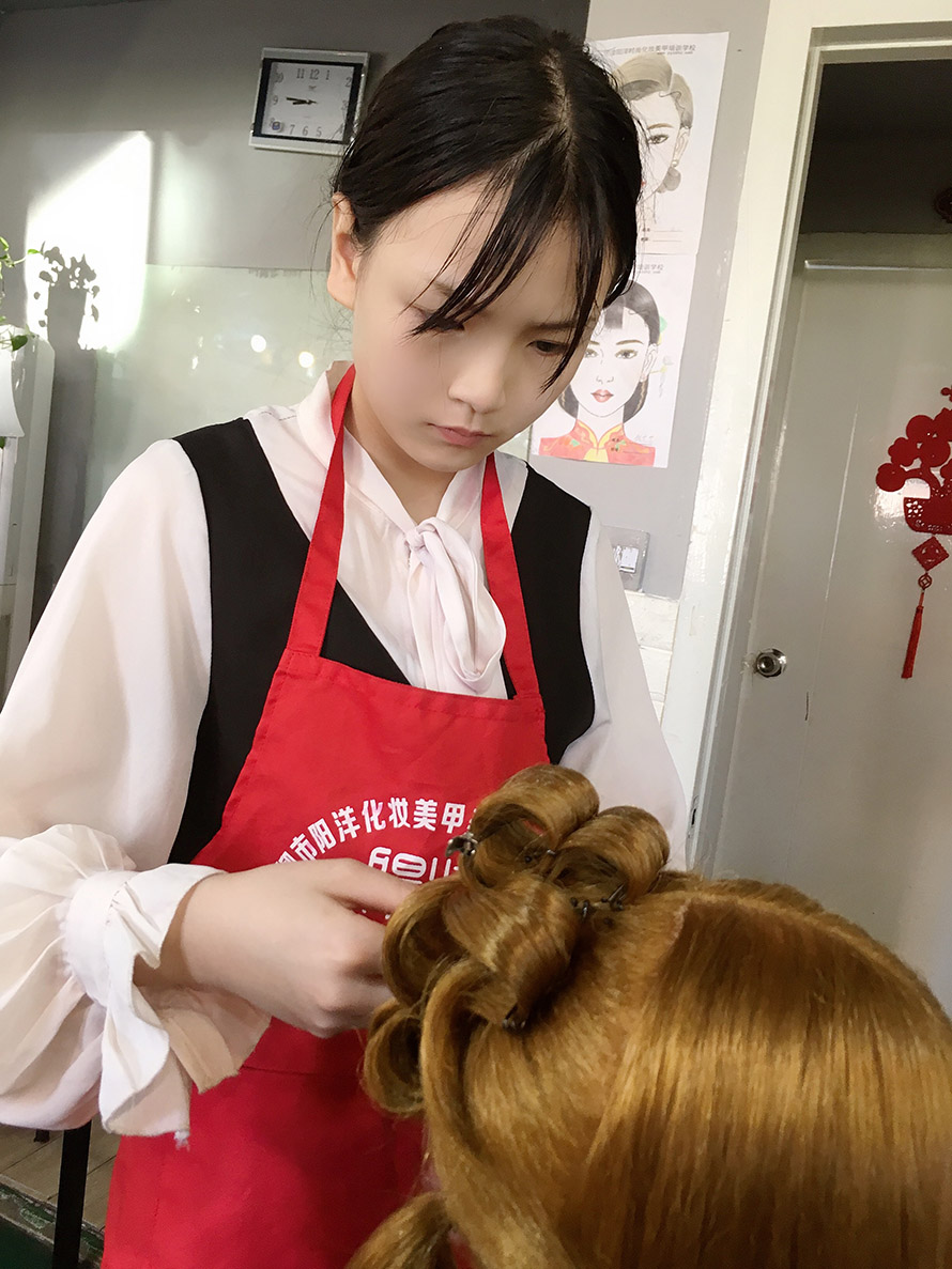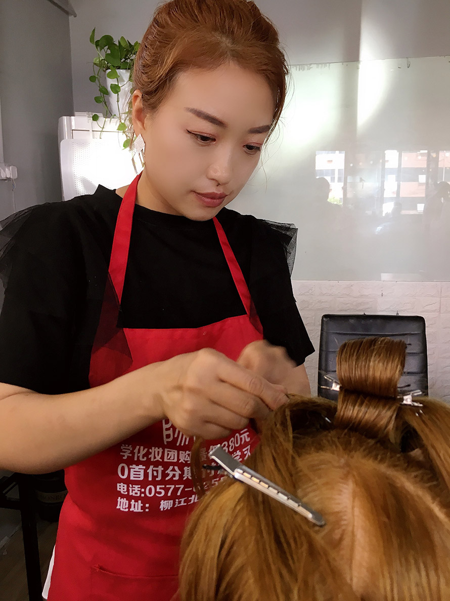 剛開始都是在假人頭上進(jìn)行編發(fā),等到熟練掌握盤發(fā)技巧后才開始真人實(shí)操,