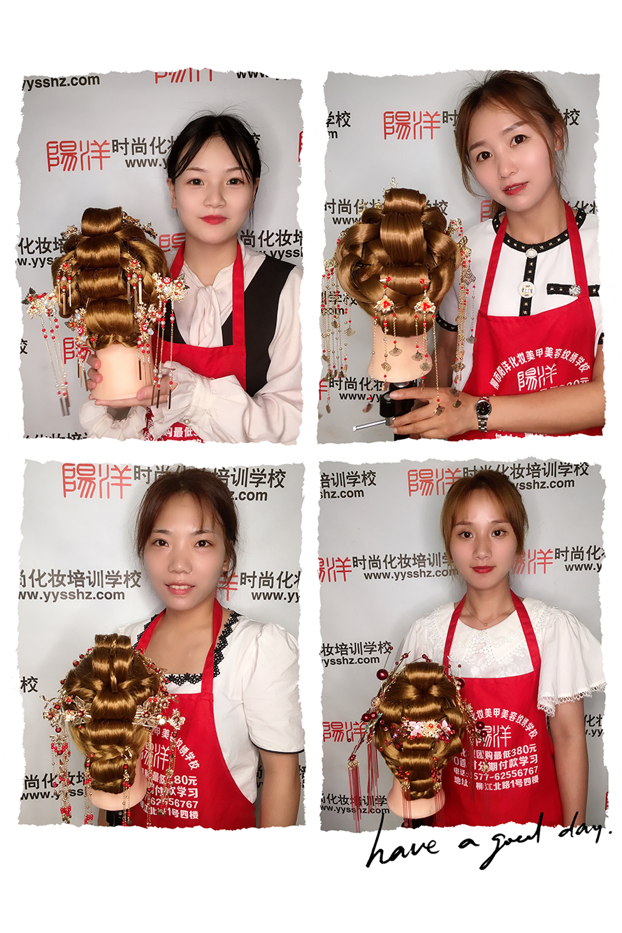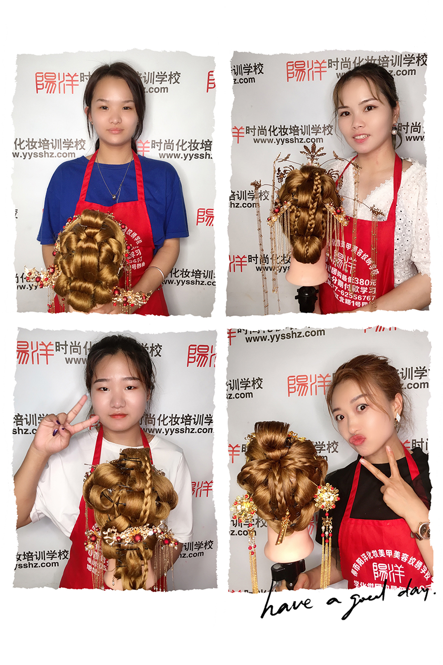 精致的造型背后是發(fā)型班所有學(xué)員每日努力練習(xí)所取得的成果,剛開始學(xué)習(xí)都是先在假人頭上練習(xí)基礎(chǔ)的編發(fā)以及相關(guān)盤發(fā)工具的認(rèn)識(shí)和運(yùn)用技巧。