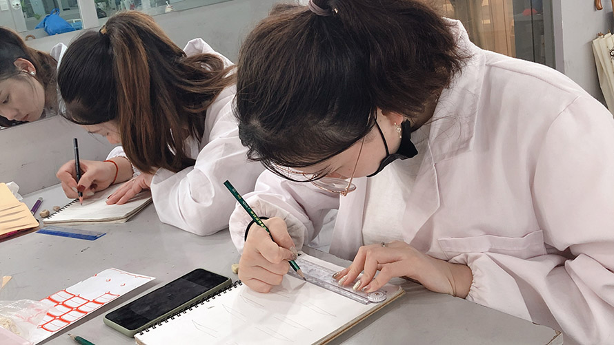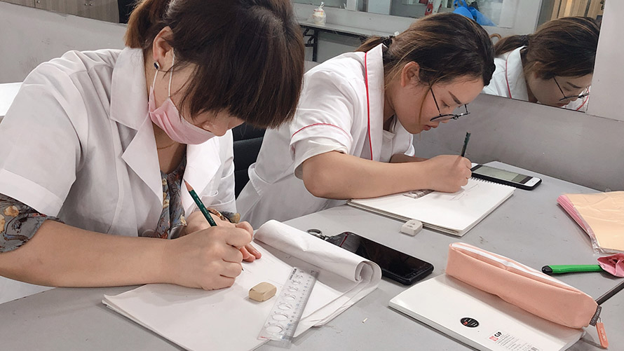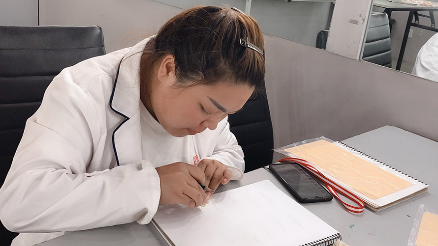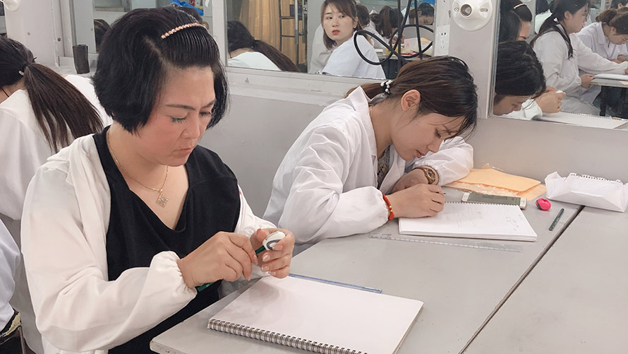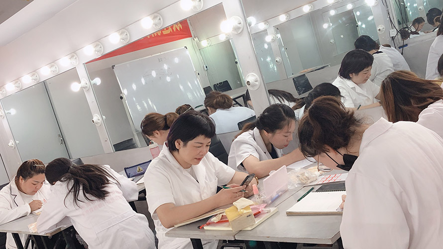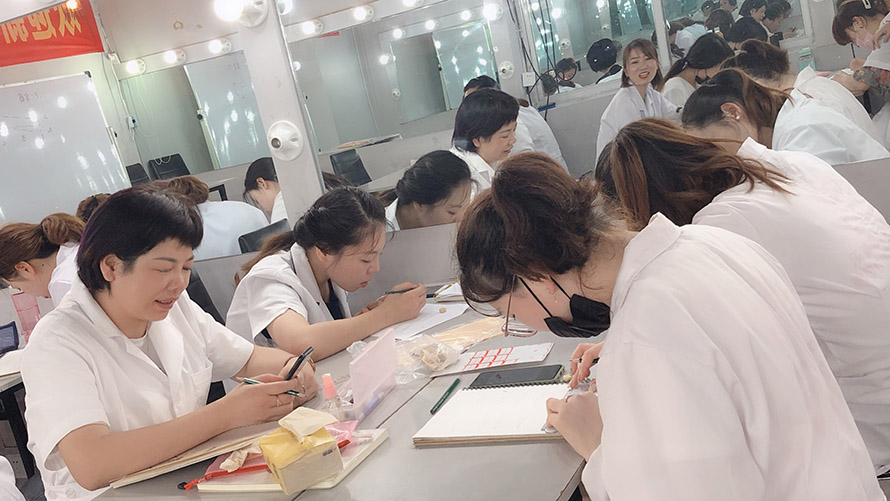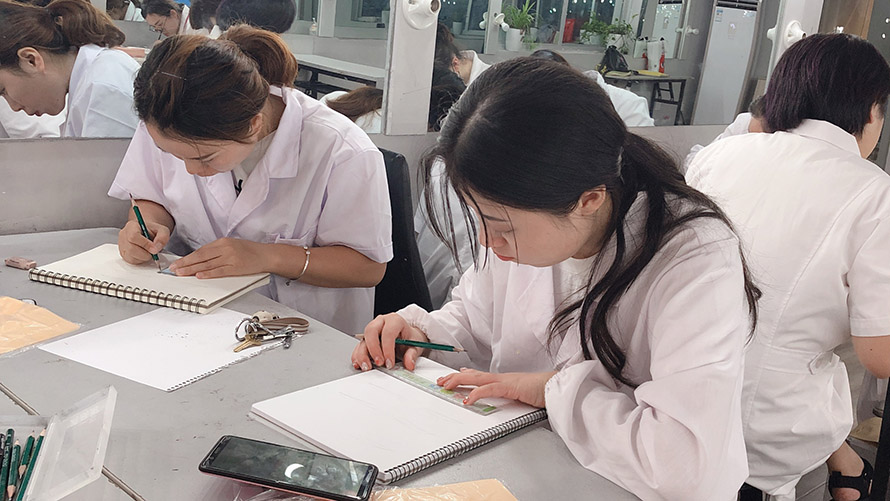來(lái)學(xué)習(xí)的學(xué)員都是0基礎(chǔ)的學(xué)員,老師先教他們?cè)诒咀由袭嬓?,本子上畫型?huì)后老師在教她們?cè)谄ど暇毩?xí)眉型,皮上練習(xí)好后再到真人臉上做真人實(shí)操,之所以陽(yáng)洋學(xué)校學(xué)員都學(xué)的很棒,是因?yàn)榛A(chǔ)打的牢固。