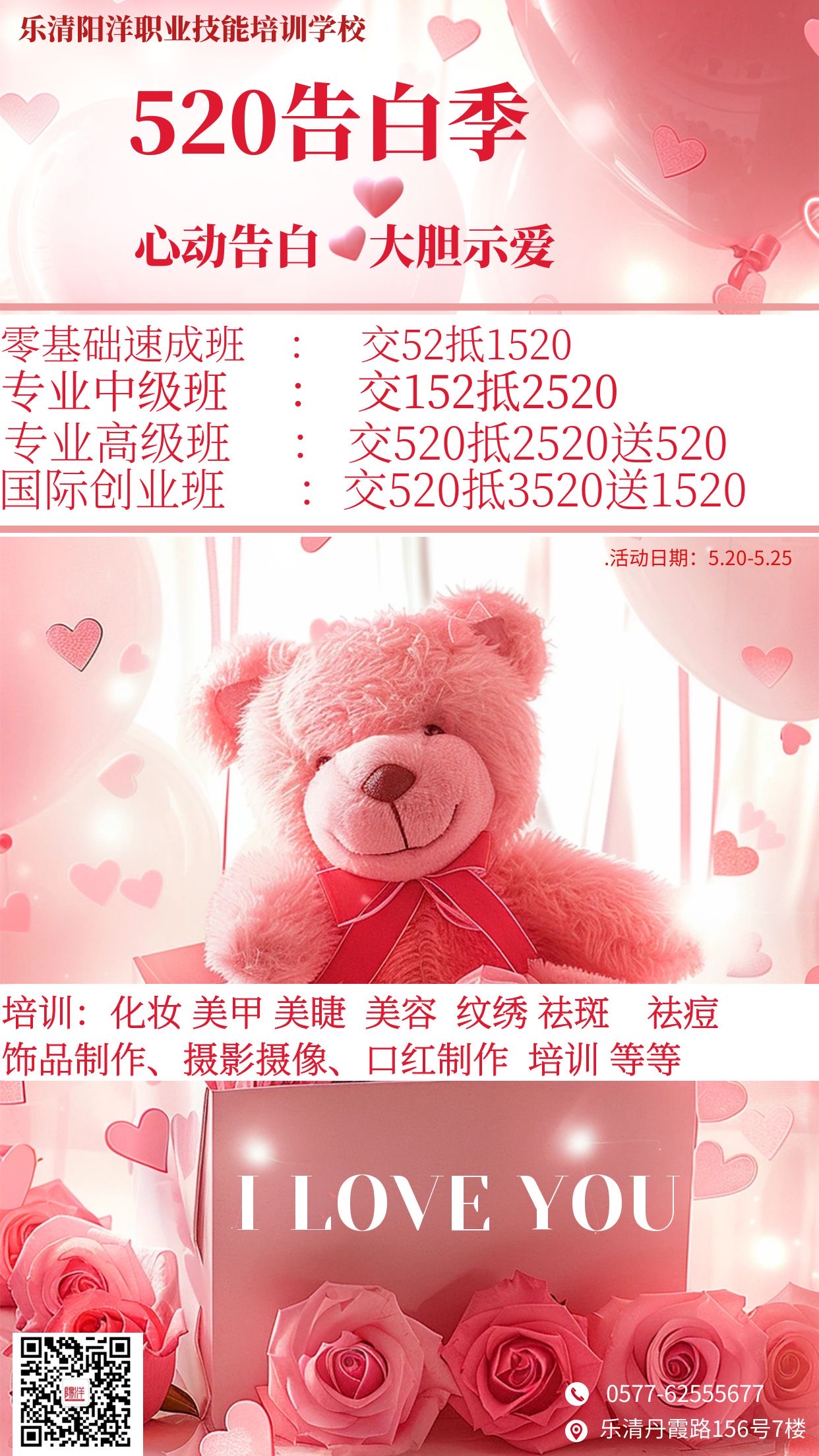當(dāng)前位置:樂清市陽洋職業(yè)技能培訓(xùn)學(xué)校 » 優(yōu)惠資訊| 樂清陽洋心動520特別活動!最高可享受3520補貼?。?!發(fā)布時間:2024-5-20 8:47:25  瀏覽次數(shù):2004 | ||