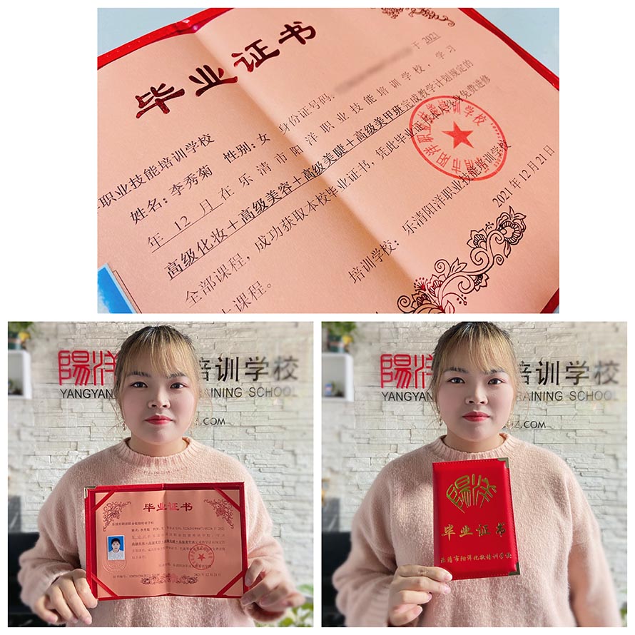 陽(yáng)洋化妝職業(yè)技能培訓(xùn)學(xué)校恭喜李秀菊同學(xué)順利畢業(yè),成為全能美業(yè)人才! 李秀菊同學(xué)在學(xué)習(xí)期間非常勤奮刻苦,用心鉆研技術(shù), 對(duì)待同學(xué)親切熱情,對(duì)待老師尊敬有禮。