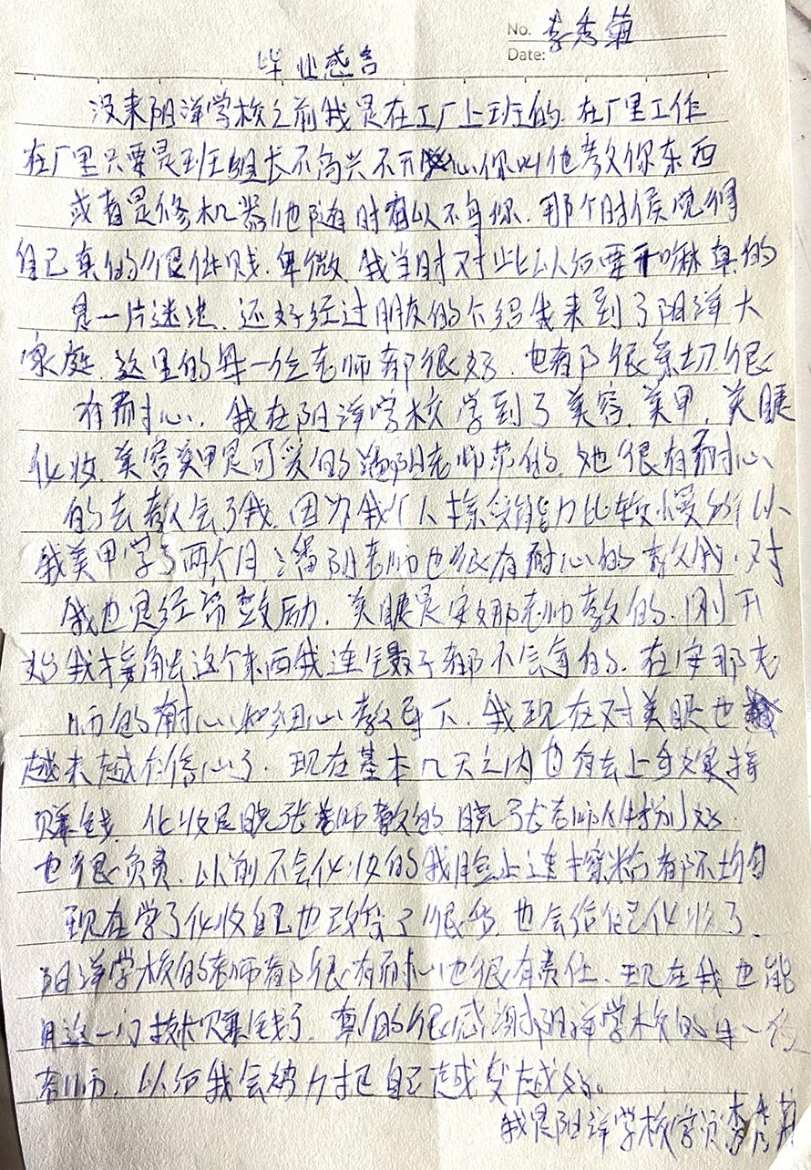 當(dāng)前位置:樂(lè)清市陽(yáng)洋職業(yè)技能培訓(xùn)學(xué)校 » 學(xué)員感悟李秀菊畢業(yè)感言發(fā)布時(shí)間:2021-12-22 15:41:39瀏覽次數(shù):1994 |