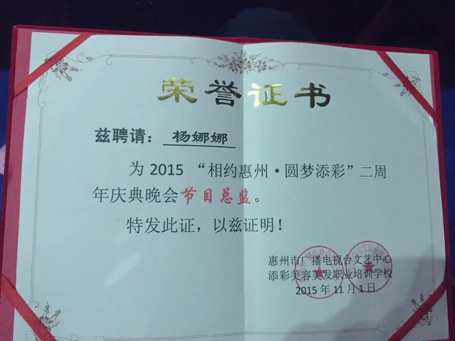 當前位置:樂清市陽洋職業(yè)技能培訓學校 » 學校新聞樂清陽洋時尚化妝培學校楊娜娜老師受邀2015“相約惠州 圓夢添彩"慶典晚會擔任節(jié)目總監(jiān)發(fā)布時間:2015-11-6 11:21:18  瀏覽次數(shù):1967  |
