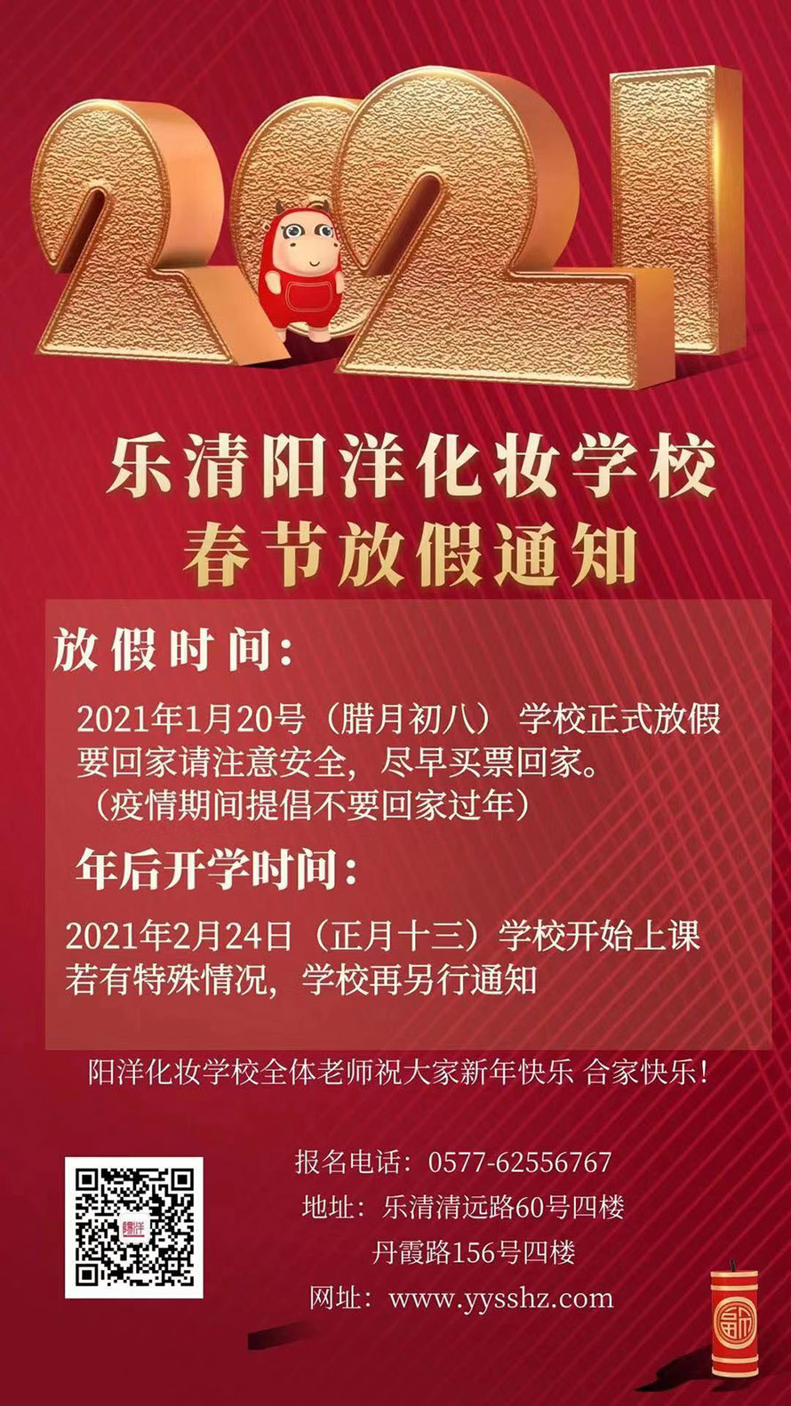 樂清陽洋時尚化妝培訓學校溫馨提醒: 陽洋化妝學校將于2021年1月20日正式放假! 要回家的同學們請?zhí)崆百徠保?/span>疫情期建議不要逗留注意安全! (疫情期間提倡盡量不要長途奔波) 提前祝大家新年快樂!