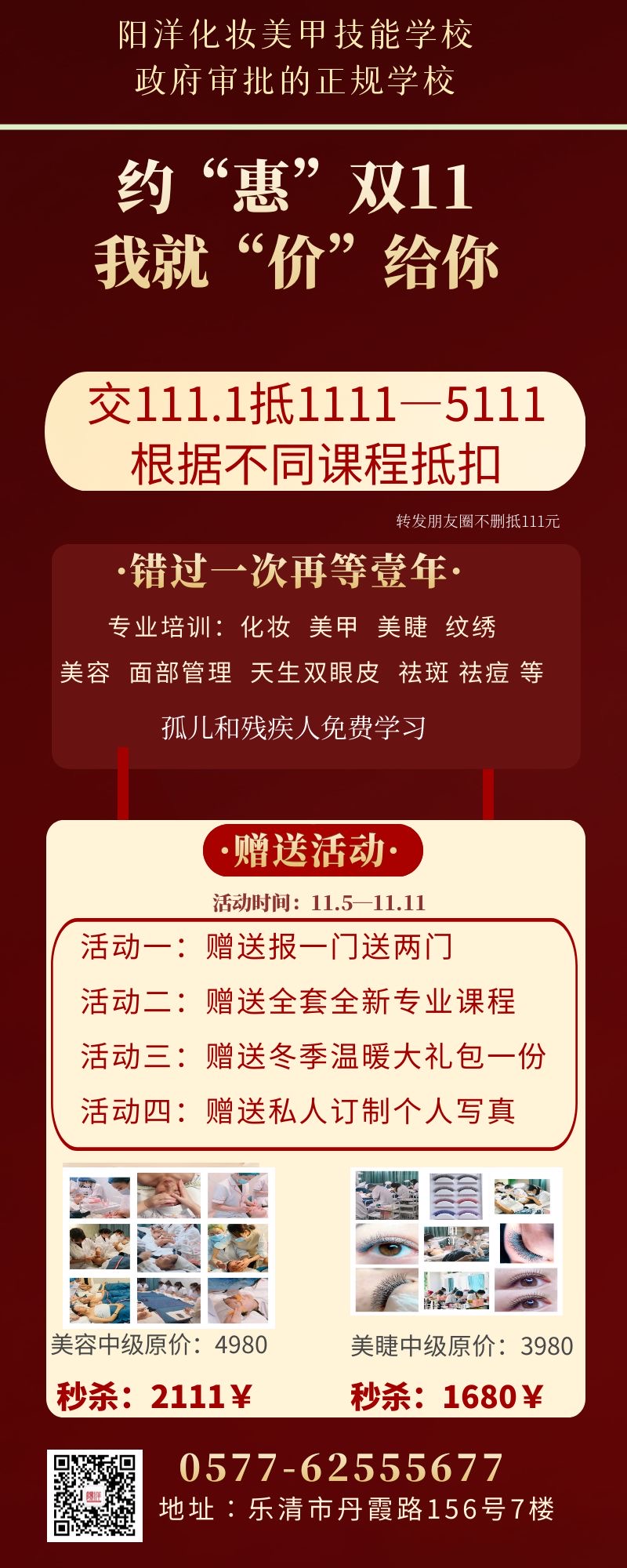 當(dāng)前位置:樂清市陽洋職業(yè)技能培訓(xùn)學(xué)校 » 學(xué)校新聞2021年雙11購課活動(dòng)火熱開啟啦!想學(xué)習(xí)的快來報(bào)名吧!#樂清哪里有學(xué)化妝美甲美睫紋繡美容?發(fā)布時(shí)間:2021-11-5 9:53:30 瀏覽次數(shù):1991 |