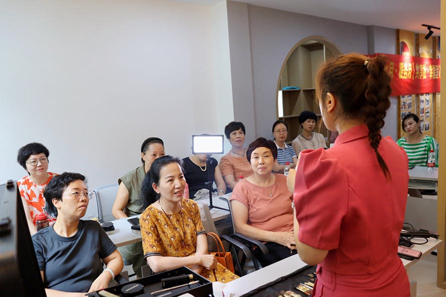 外面天氣炎熱,不能阻擋大家對美的追求, 陸陸續(xù)續(xù)來了二十幾位女性。課堂上,我們楊老師, 用通俗易懂的語言講解美妝工具選擇、護膚知識、 化妝用品選擇、彩妝技巧等日常化妝知識,并著重講解如何根據(jù)臉型畫眉、 根據(jù)個人皮膚特點選擇化妝品,干貨滿滿,大家聽得津津有味。