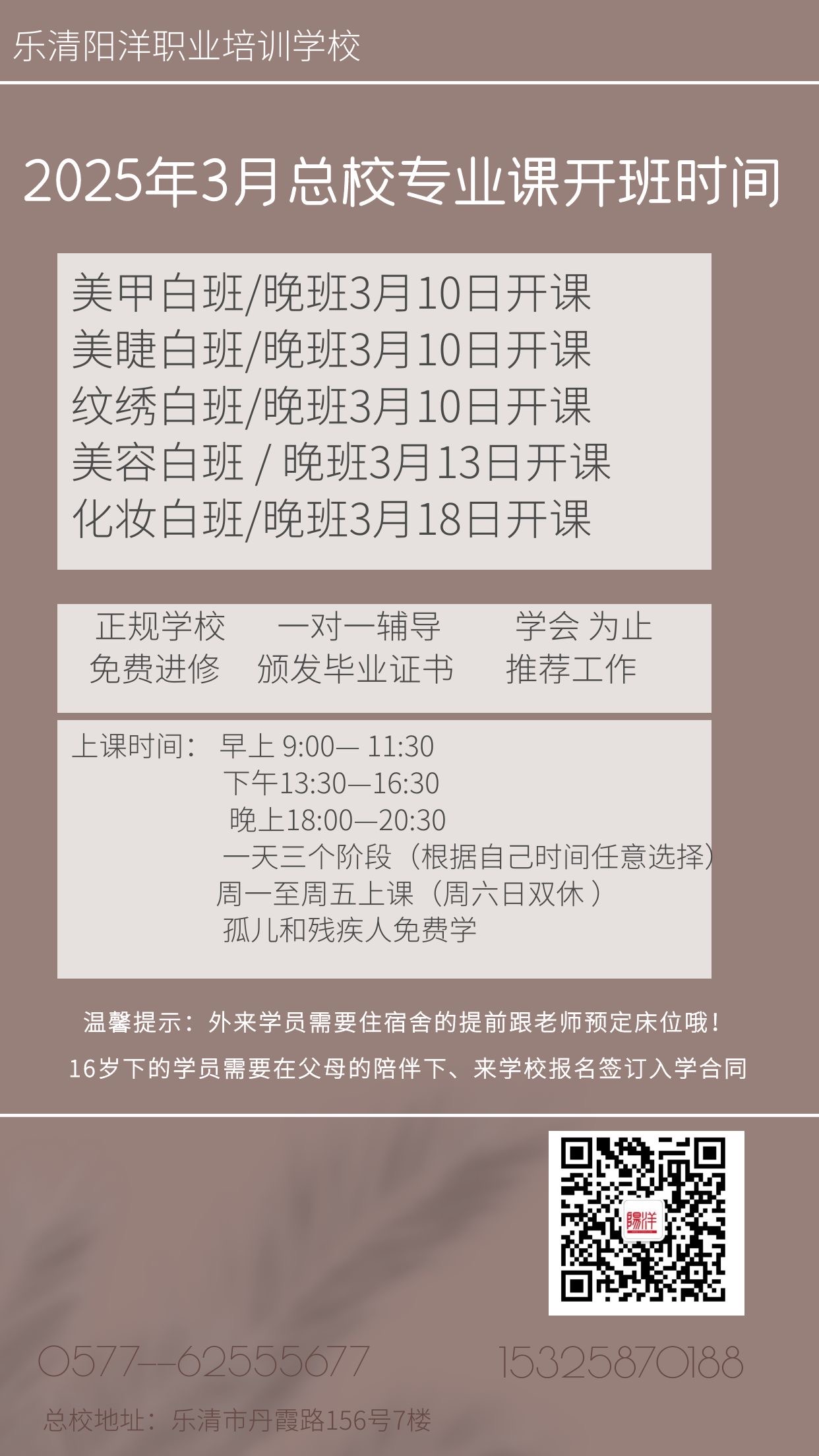當前位置:樂清市陽洋職業(yè)技能培訓學校 » 學校新聞樂清陽洋3月開課信息時間—樂清哪里有學化妝|樂清化妝學校|樂清美甲學校發(fā)布時間:2025-3-3 9:35:29 瀏覽次數(shù):1985 |