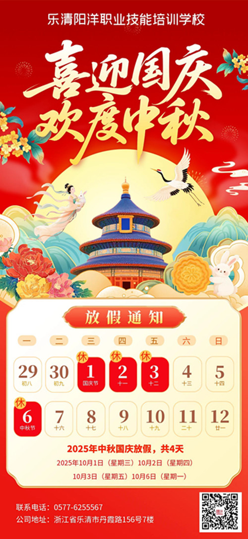 當(dāng)前位置:樂清市陽洋職業(yè)技能培訓(xùn)學(xué)校 » 學(xué)校新聞樂清陽洋職業(yè)技能培訓(xùn)學(xué)校 | 中秋國慶放假通知發(fā)布時間:2025-9-29 15:55:22 瀏覽次數(shù):63 |