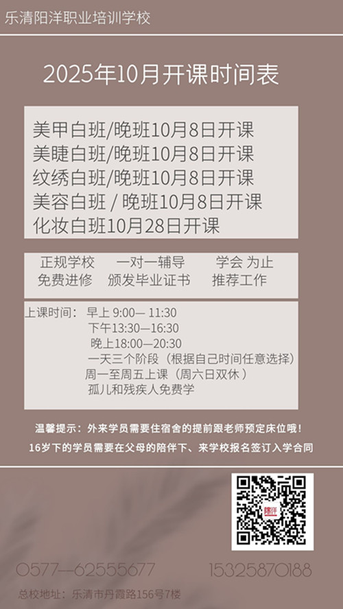 當(dāng)前位置:樂清市陽洋職業(yè)技能培訓(xùn)學(xué)校 » 學(xué)校新聞2025年10月開課時(shí)間表|樂清哪里有學(xué)化妝|柳市哪里有學(xué)化妝|虹橋哪里有學(xué)化妝|學(xué)化妝多少錢|發(fā)布時(shí)間:2025-9-29 16:00:06 瀏覽次數(shù):60 |