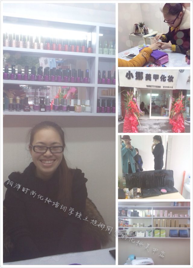 2013年11月17日畢業(yè)于樂清陽(yáng)洋時(shí)尚化妝美甲培訓(xùn)學(xué)校學(xué)生!王旭娜同學(xué)開的一家屬于自己的化妝美甲店!2014年1月8日開業(yè)!祝愿小娜化妝美甲店生意興?。∫环指冻鍪质杖?!旭娜加油?。?!