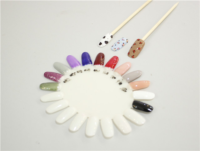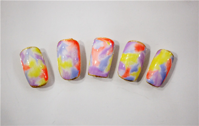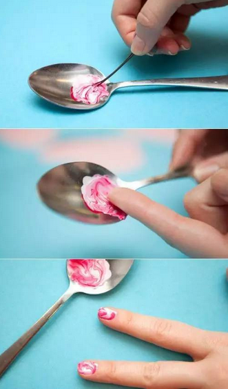 在上過護(hù)甲油后,將多色甲油滴入水中,用牙簽攪動(dòng)成你想呈現(xiàn)的效果,注意不要攪拌過度破環(huán)層次感;將手指貼近沾取,用工具輔助讓甲油層完全貼合;擦去多余處,封釉。