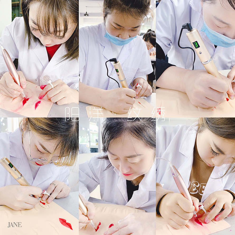 2.當(dāng)把唇型掌握的心中有型時(shí),老師會(huì)講解唇部?jī)x器的使用方法以及操作時(shí)的手法,手把手教學(xué),零距親言講解,讓每個(gè)同學(xué)在上仿皮上練習(xí)手法,做到零創(chuàng)傷,色澤通透等等.....