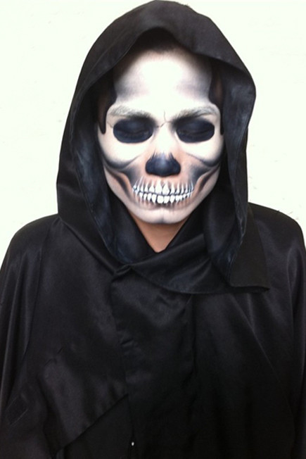所謂骷髏妝,就是要求將臉部用油彩畫成骷髏的形狀。畫這種妝需要對(duì)人的骨骼結(jié)構(gòu)有足夠的認(rèn)識(shí),所以被稱為影視妝容的基礎(chǔ)課程.是成為優(yōu)秀化妝師的必修課。