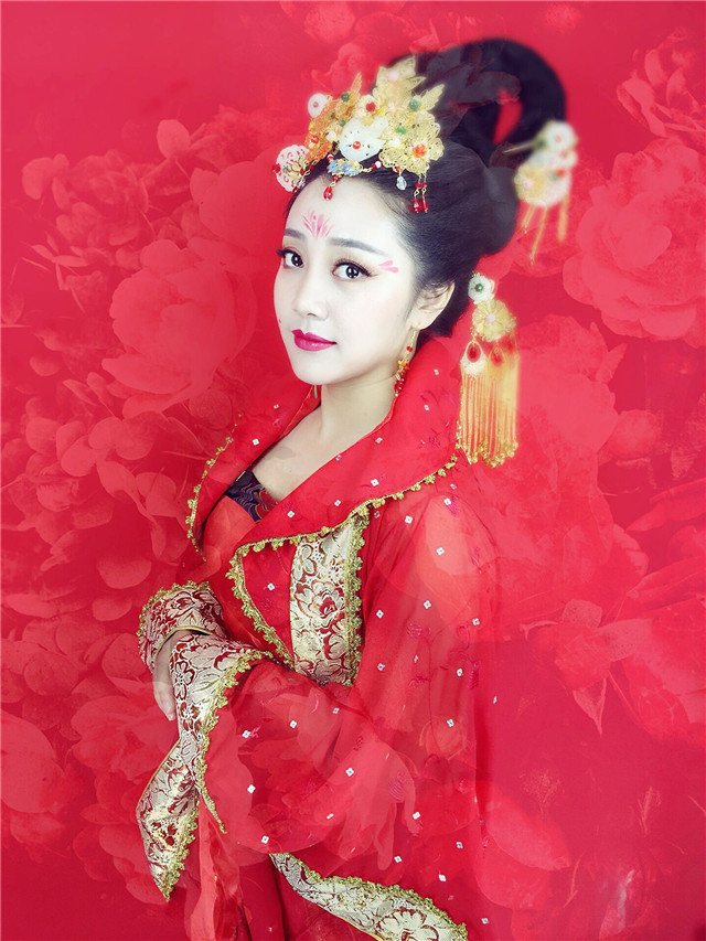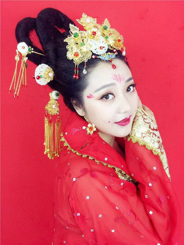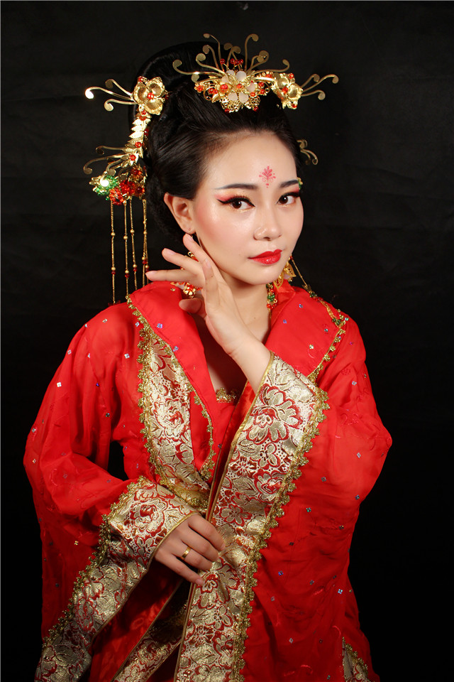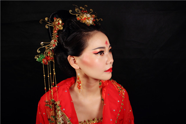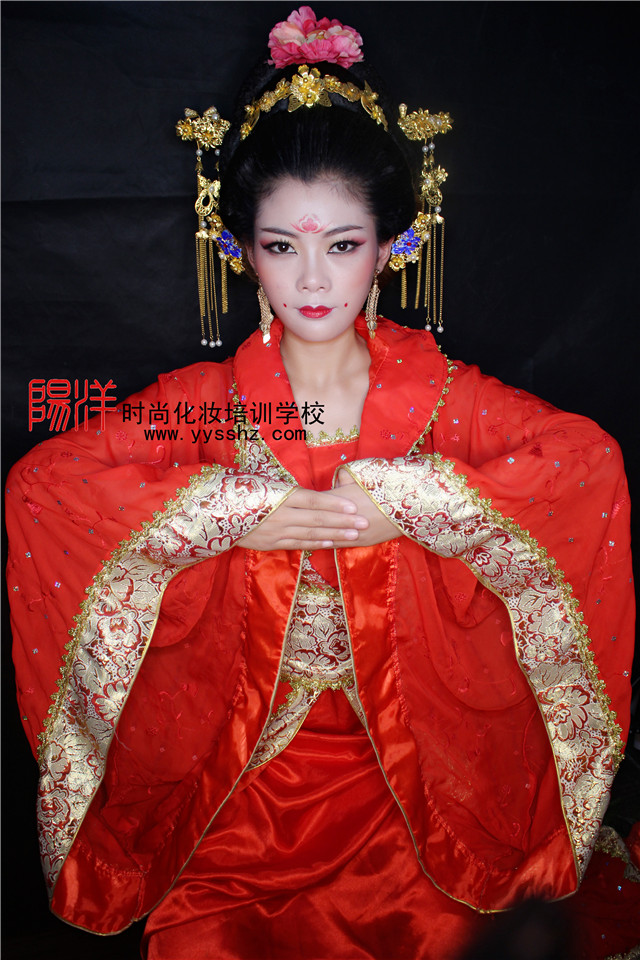 唐妝妝面造型要求:大氣,艷麗,以線色為主,紫紅桃紅等均可,整體嫵媚動人。