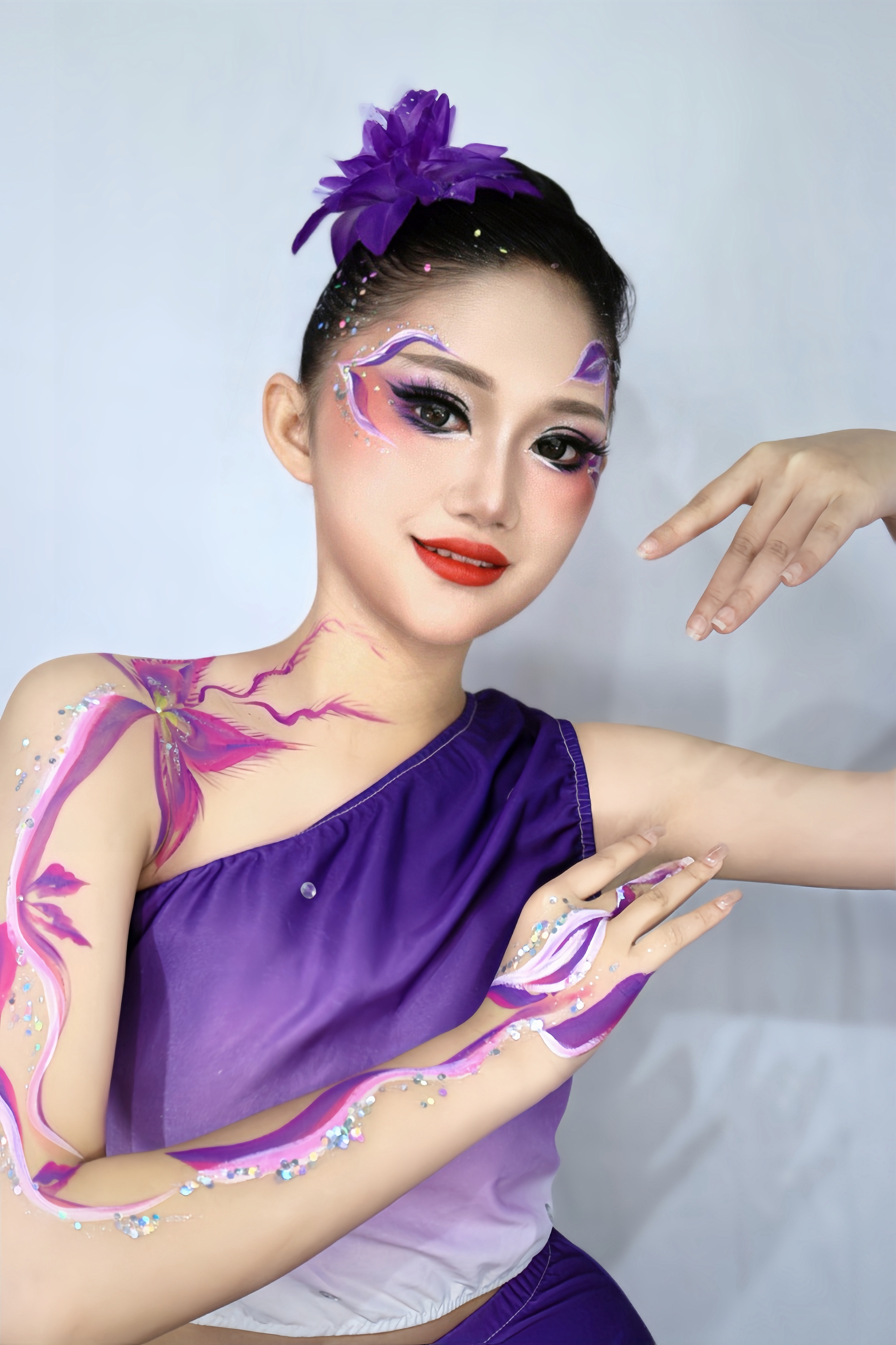 , 面部妝容只是呈現(xiàn)一部分, 加上手臂的彩繪整個延展線條的流動性, 以紫色為主,搭配其他色彩加以點(diǎn)綴, 適量亮鉆的運(yùn)用,更加生動又氣質(zhì)。